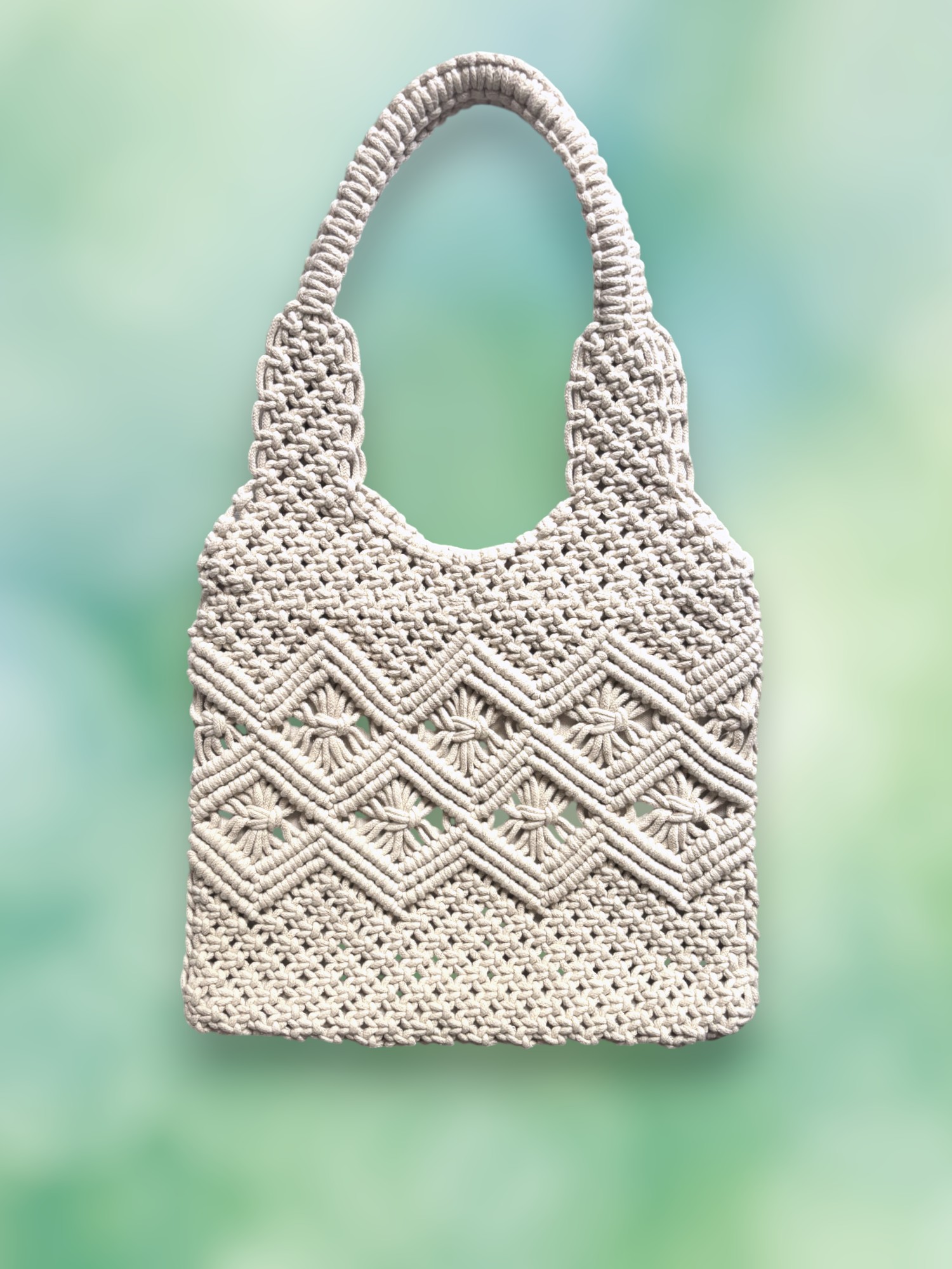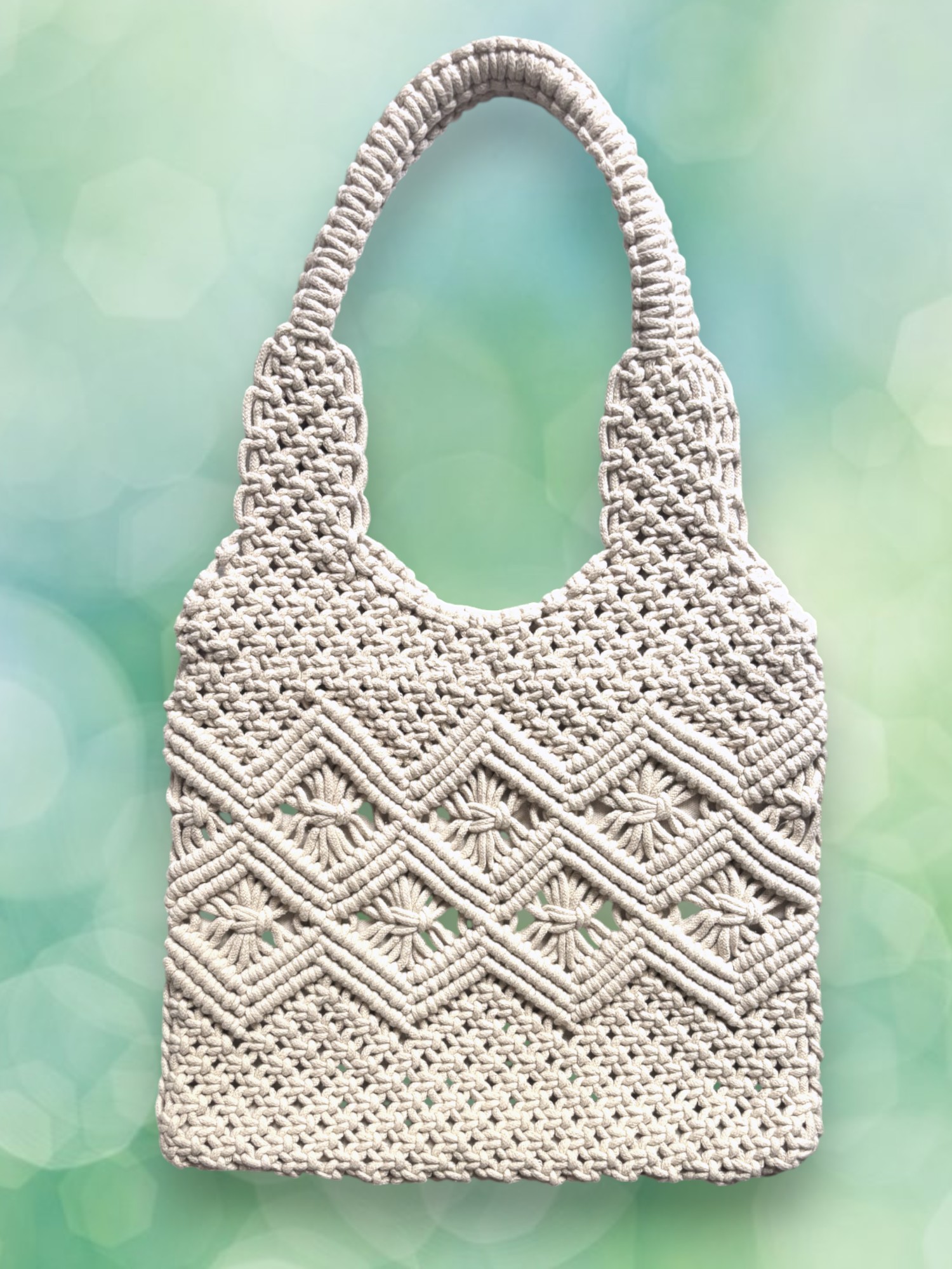 - Beautifully handwoven macrame bag featuring an intricate chevron pattern and decorative weave detail in pure white cotton