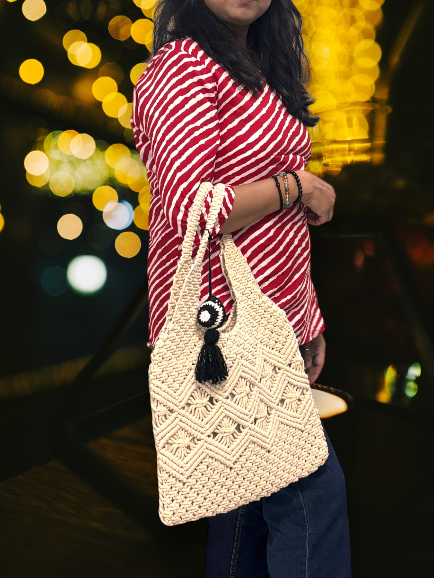 The medium-sized bag offers practical functionality with its double handle design, making it comfortable to carry while adding a sophisticated touch to your ensemble. The geometric patterns and textured weaving create a beautiful interplay of light and shadow, while the neutral white colour makes it versatile enough to complement any outfit. This bag combines traditional macrame techniques with contemporary design sensibilities. The spacious interior provides ample room for your essentials, while the durable cotton construction ensures lasting quality. The handles offer a secure grip and comfortable carrying experience. This handmade piece comes with a cute evil eye bag charm