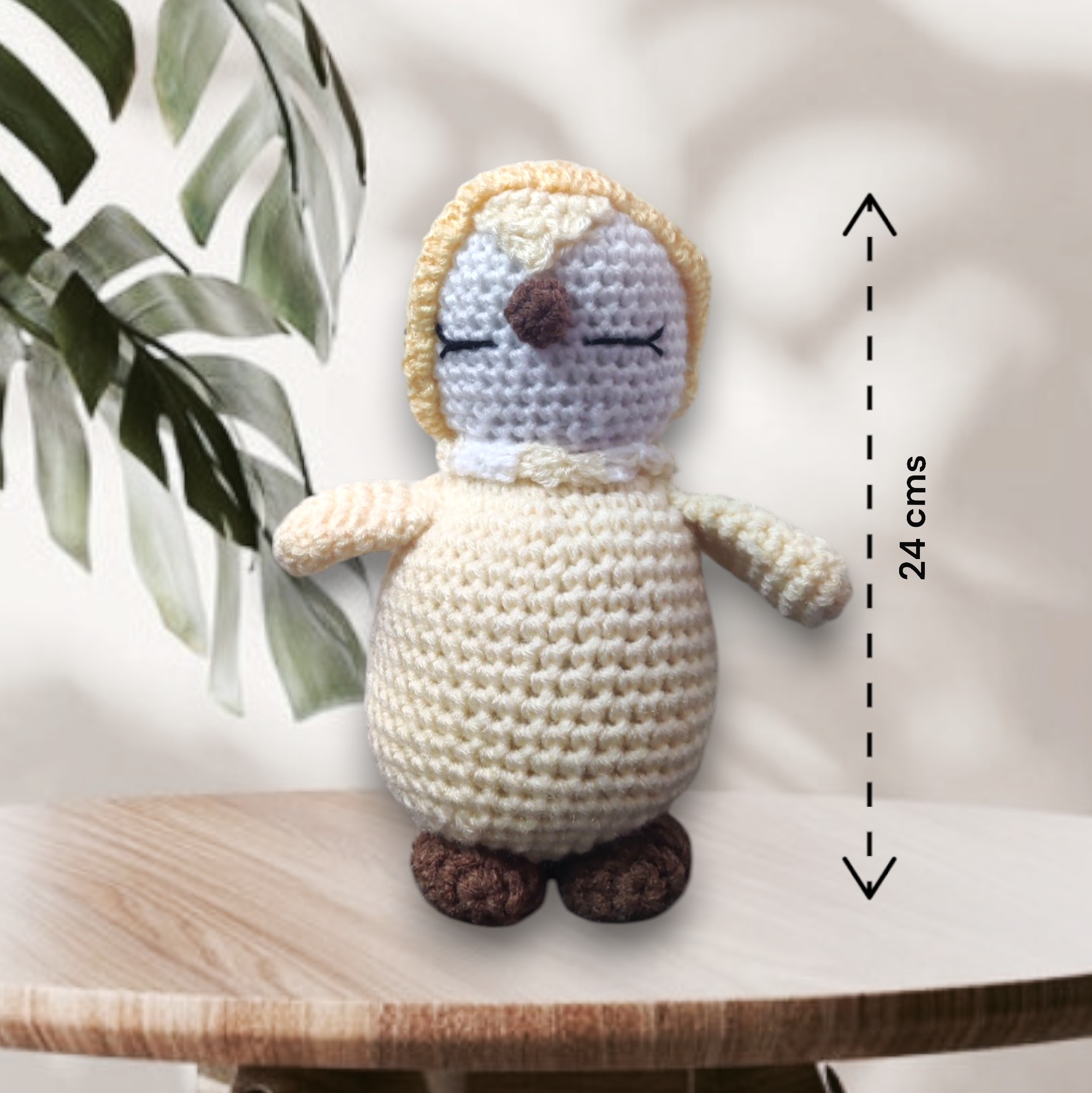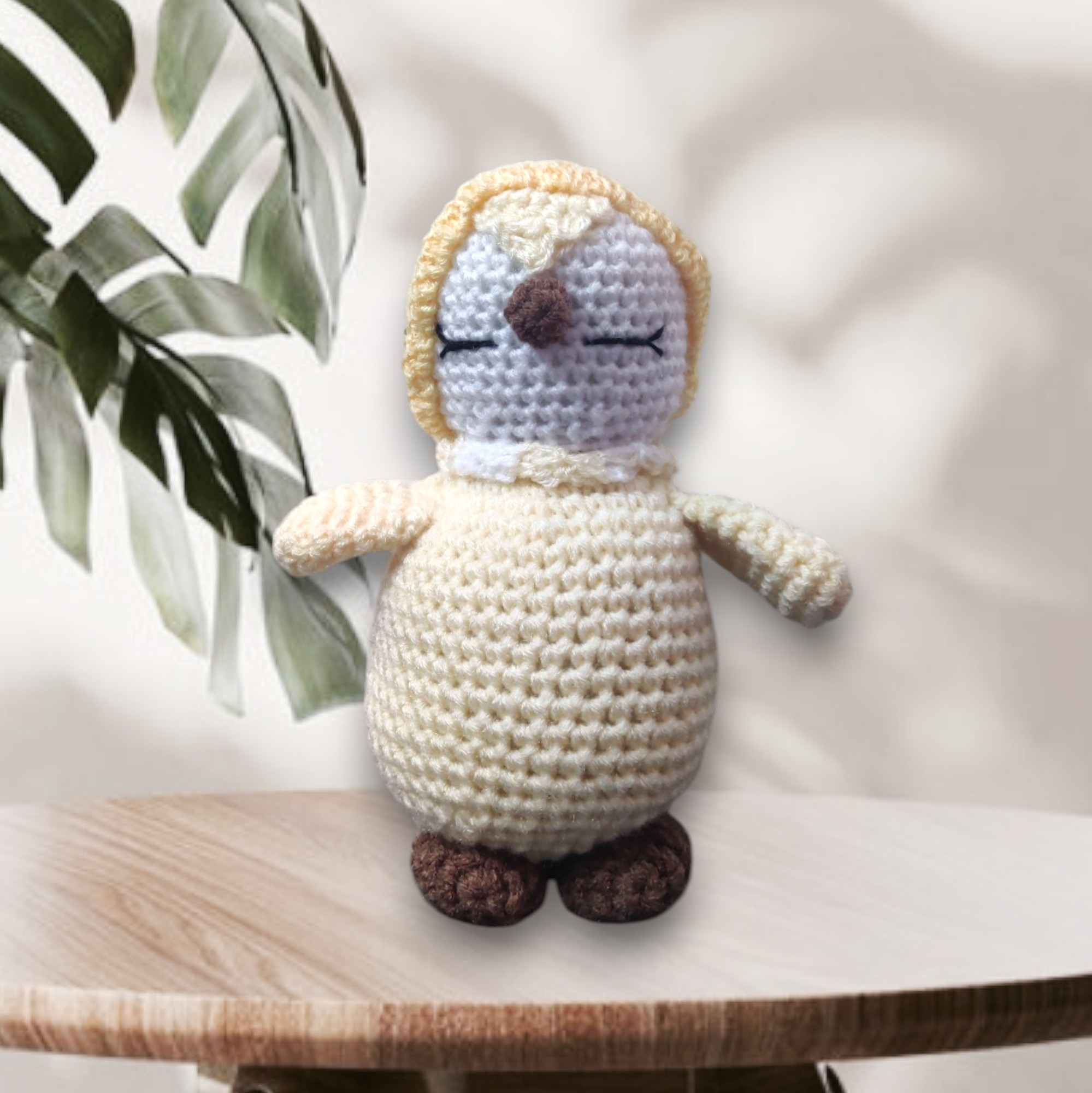 Introducing this charming handmade crochet penguin plush toy, meticulously crafted in soothing cream and grey colours. This adorable amigurumi stuffed animal features a round, plump body with delicate hand-stitched details, including sweet closed eyes and tiny brown feet. Standing approximately 15 cm tall, this cuddly companion is perfect for both play and display. The penguin showcases expert craftsmanship with uniform stitching throughout, creating a delightfully textured surface that’s pleasant to touch. Each stitch is carefully placed to ensure durability and long-lasting enjoyment. The cream-coloured body, complemented by a grey face and subtle details, gives this penguin a gentle, calming presence.