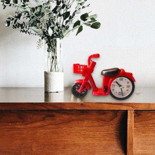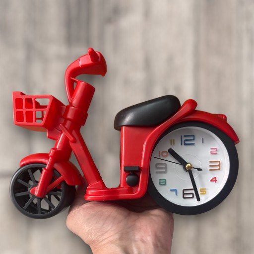 • Adorable scooter-shaped alarm clock in vibrant red colour featuring a charming design with a built-in basket, perfect for adding personality to any room decor