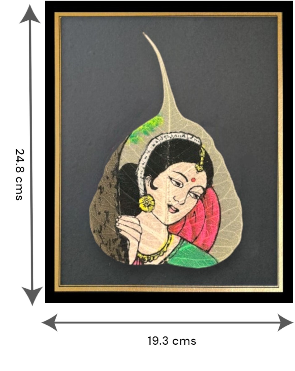 - Handcrafted and hand-painted classical Indian art on genuine Peepal leaf, showcasing traditional Indian woman