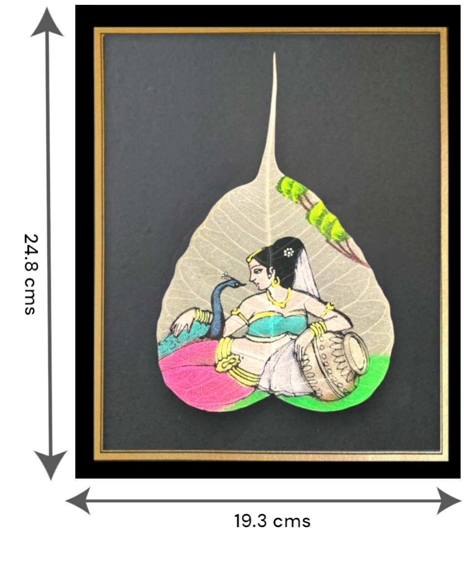 Traditional Indian Peepal Leaf Art, Hand-Painted Classicals, Framed Painting of Woman and Peacock